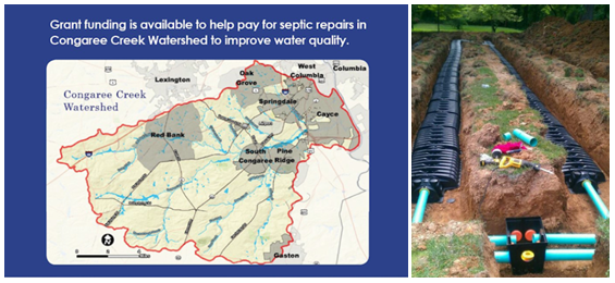 There are funds available to help pay for approved septic repairs/replacements for failing systems in the Congaree Creek Watershed. Remember, this isn’t just to make your neighbors take the clothes pins off their noses or so you can let the kids play in the back yard again, it’s also to improve water quality for everyone.